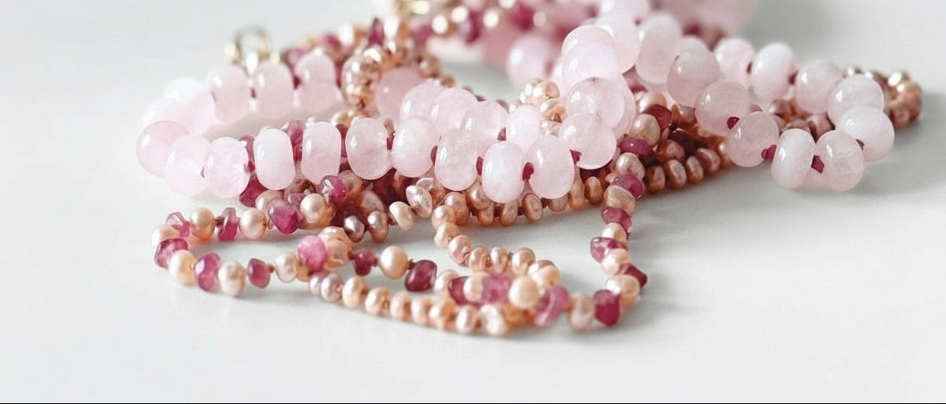 Hand-knotted with silk and adorned with natural gemstones and pearls — each necklace is designed to bring softness, radiance and timeless elegance to your everyday.