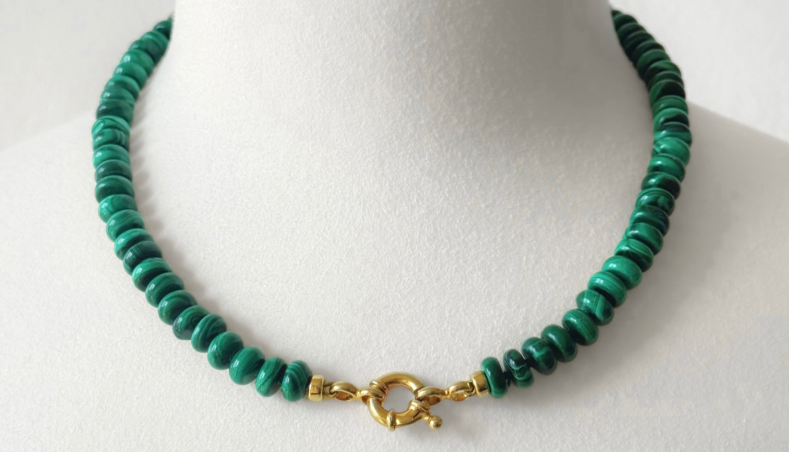 A celebration of grounding elegance and natural harmony. The Forest Serenity necklace features smooth, round malachite gemstones — each one unique in its vivid, deep-green banding that reflects the quiet beauty of nature.