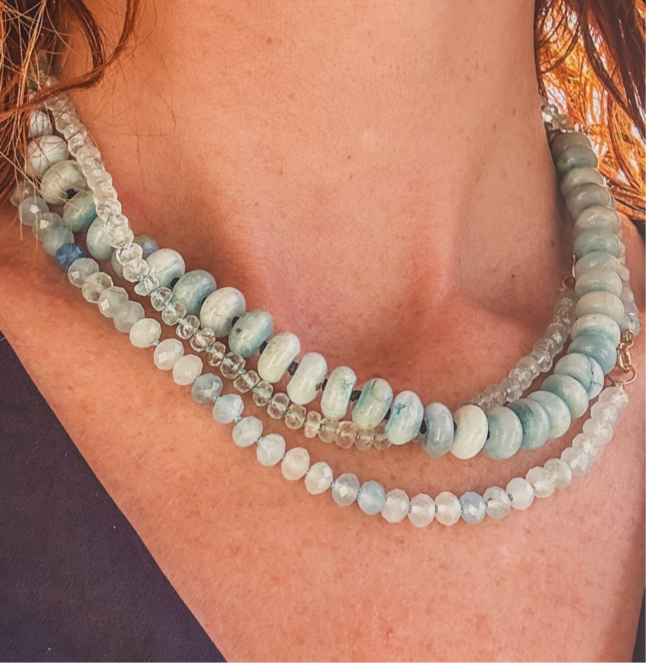 A hand-knotted aquamarine necklace featuring gemstones of rich and luminous ocean-blue. Each bead is carefully chosen for its depth of colour and natural radiance, reflecting the serene beauty of the sea.