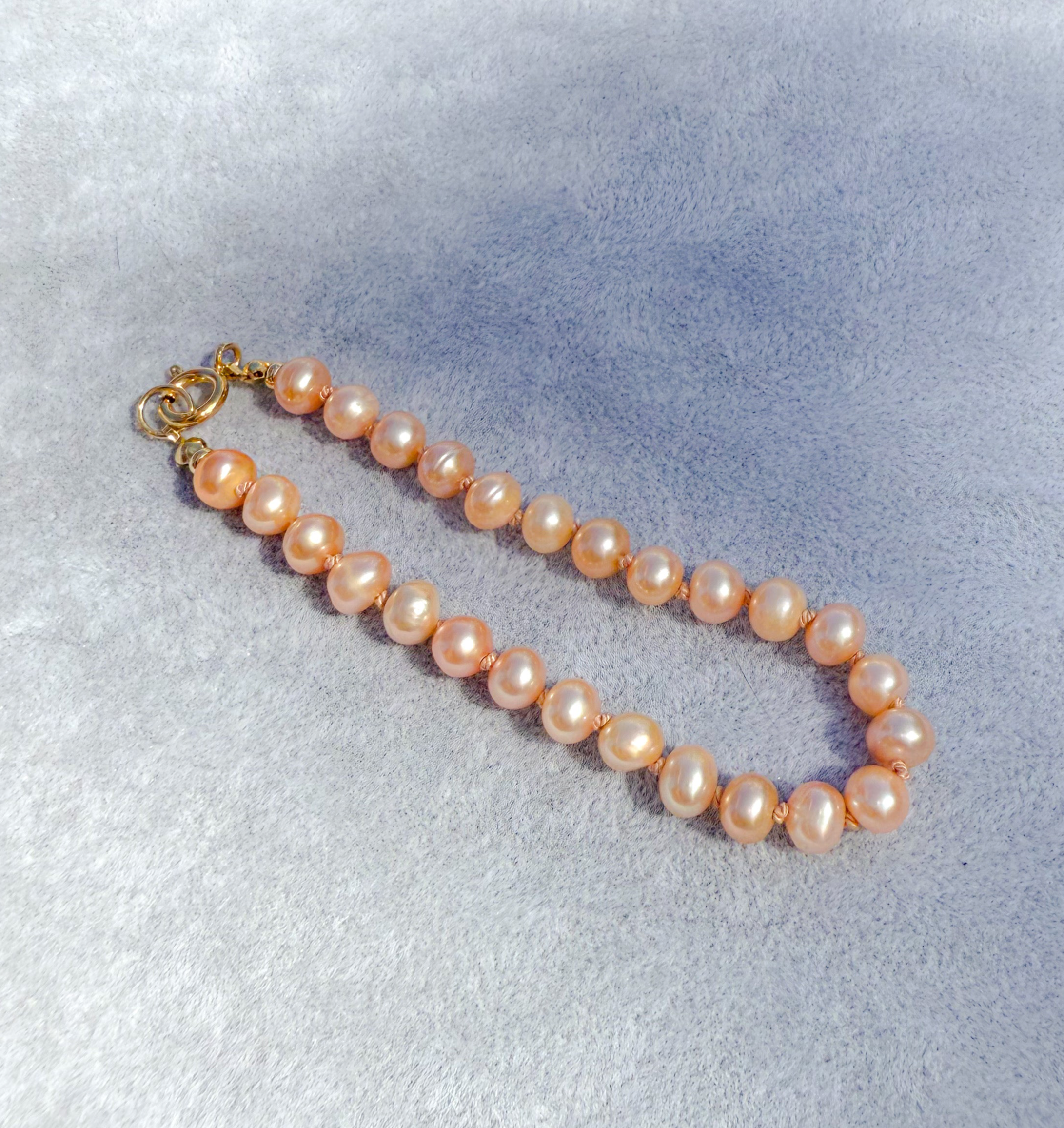 These delicate freshwater pearls in a soft blush-peach tone evoke the lightness of spring blossoms — subtle, radiant, and refined. An elegant bracelet that elevates any look with effortless sophistication.